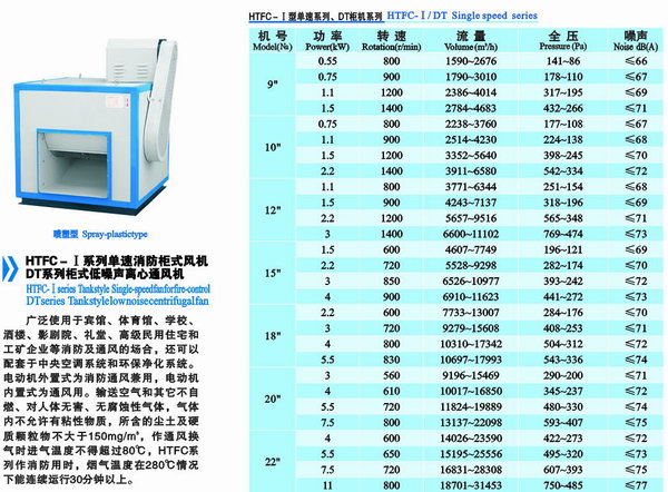 HTFC離心式消防系列風機用于體育館,地下停車場,學校,酒樓,商場,大型住宅區(qū)等消防能風場所,平時作普通通風用,發(fā)生火災時作消防排煙用時能在280℃高溫條件下連續(xù)運行30分鐘以上不損壞 。
